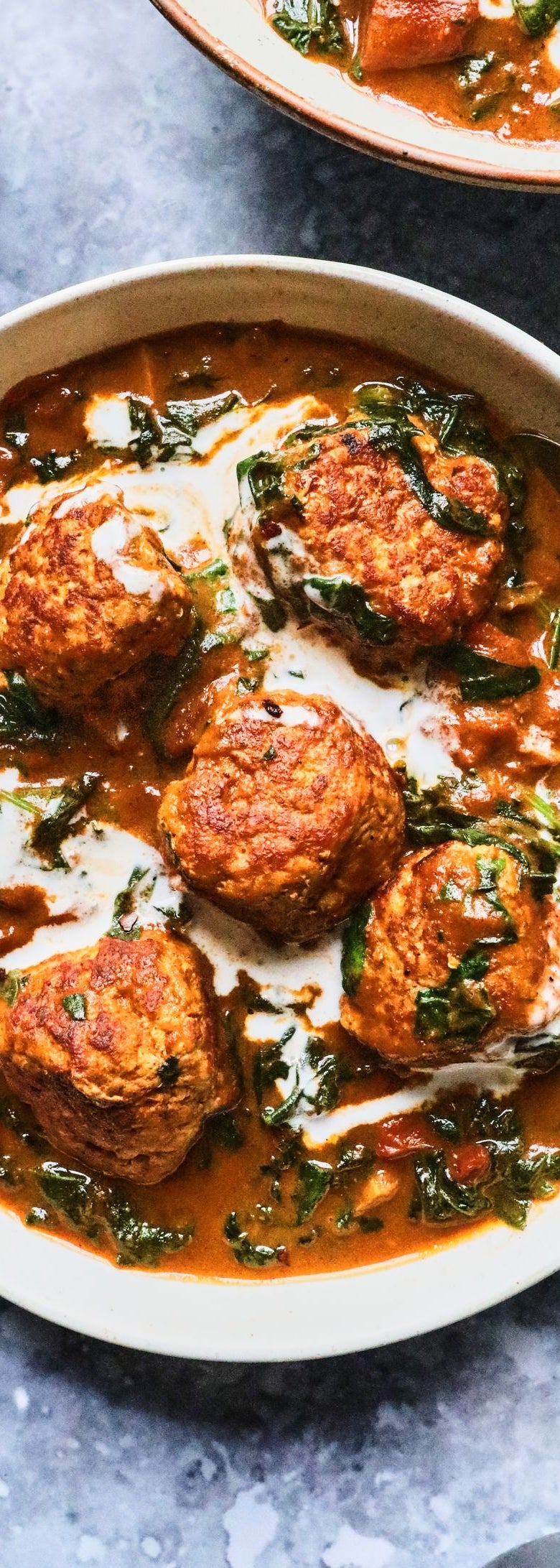 1. In a large bowl, mix the turkey mince with the grated onion, 1 clove of garlic, 1 tsp ginger, 1 tsp garam masala, and a pinch of black pepper. Shape into 12 small koftas.