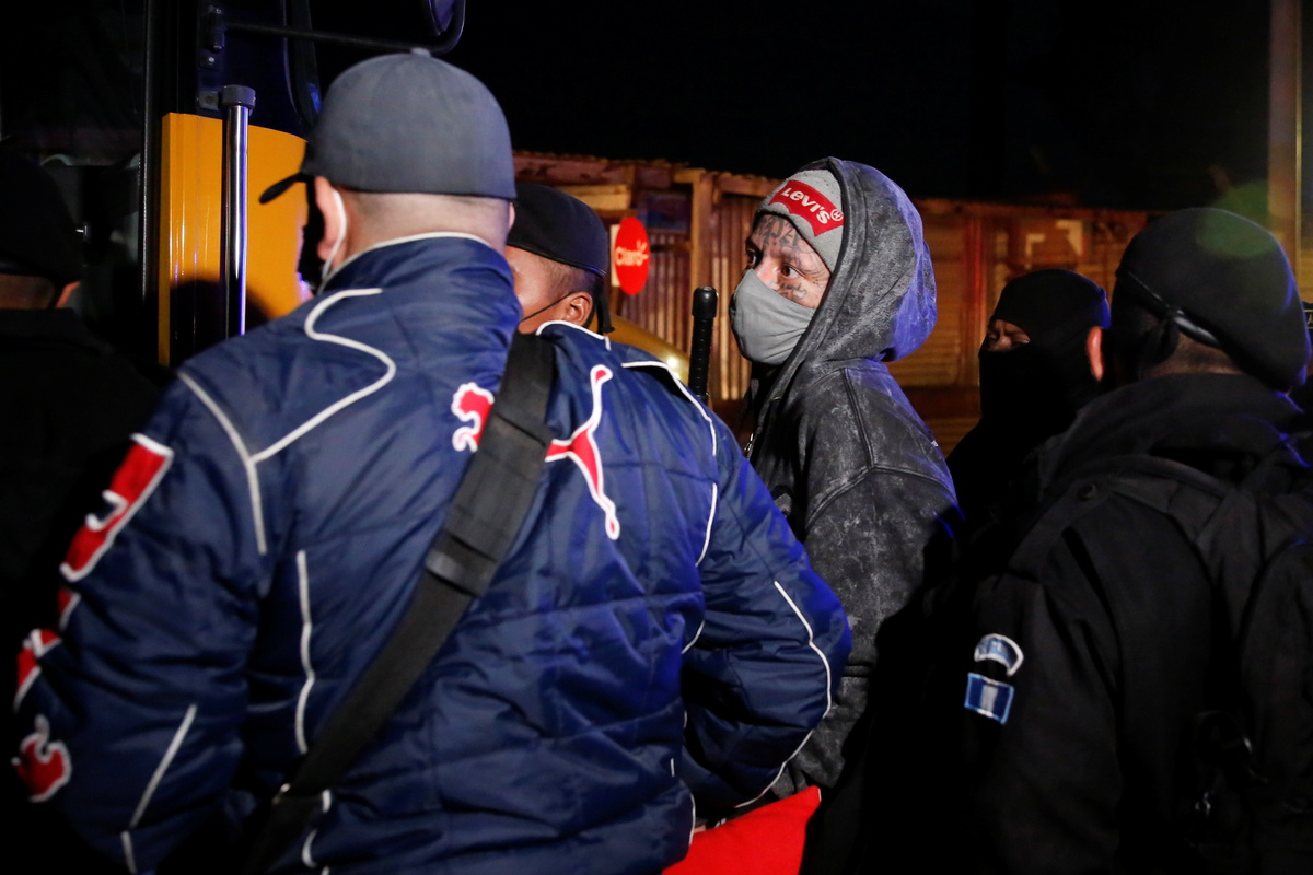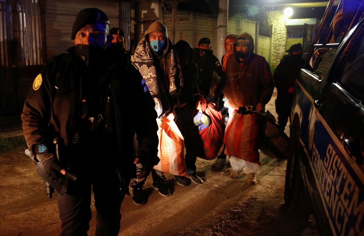 Riot police officers transfer inmates after a riot broke out at a prison facility in the municipality of Cantel, in Quetzaltenango, Guatemala May 20, 2021. REUTERS/Luis Echeverria