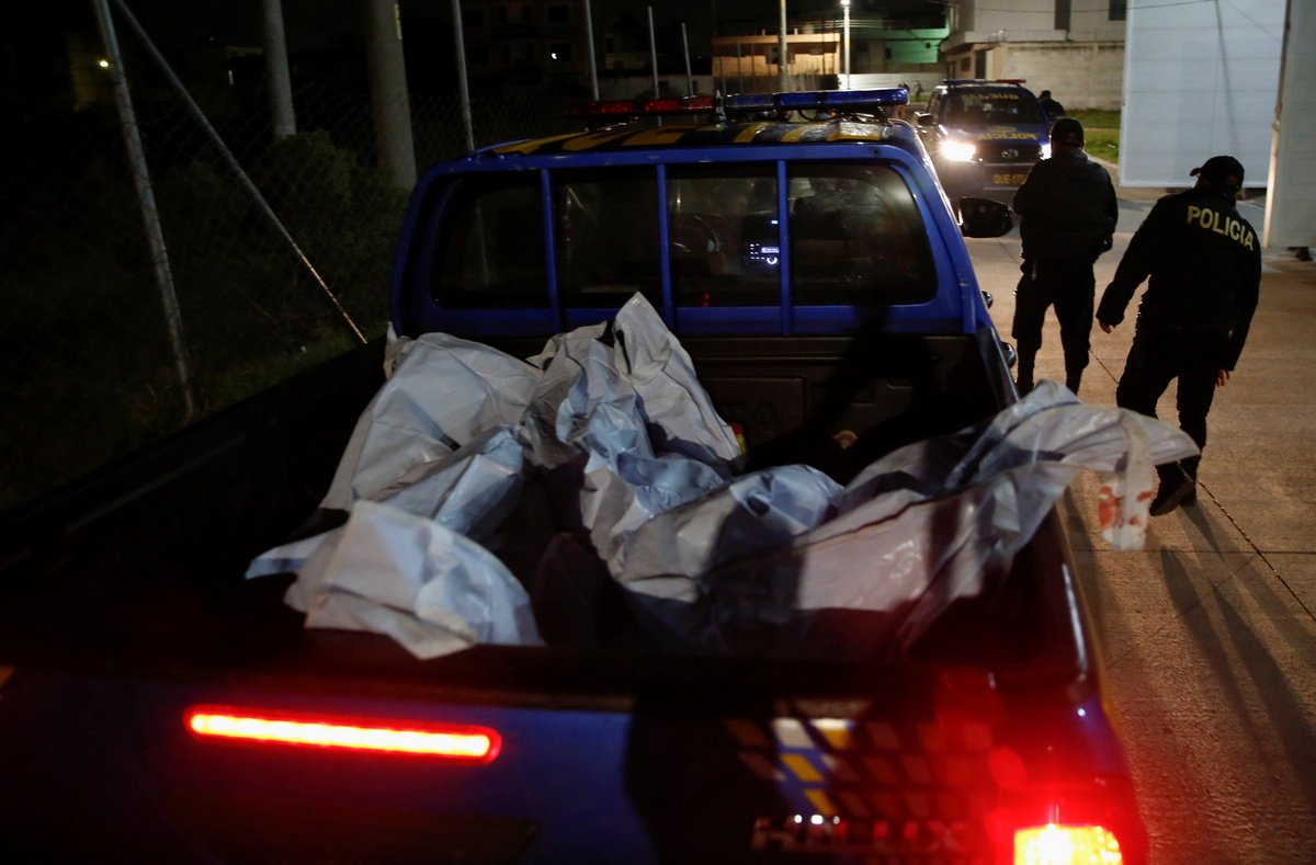 Bags containing the bodies of deceased inmates are seen in the back of a police car as police transfer the bodies of inmates who died after a riot broke out at the prison facility in the municipality of Cantel to a morgue in the municipality of Quetzaltenango, in Quetzaltenango, Guatemala, May 20, 2021. REUTERS/Luis EcheverriaBags containing the bodies of deceased inmates are seen in the back of a police car as police transfer the bodies of inmates who died after a riot broke out at the prison facility in the municipality of Cantel to a morgue in the municipality of Quetzaltenango, in Quetzaltenango, Guatemala, May 20, 2021. REUTERS/Luis EcheverriaRiot police officers transfer inmates after a riot broke out at a prison facility in the municipality of Cantel, in Quetzaltenango, Guatemala May 20, 2021. REUTERS/Luis Echeverria