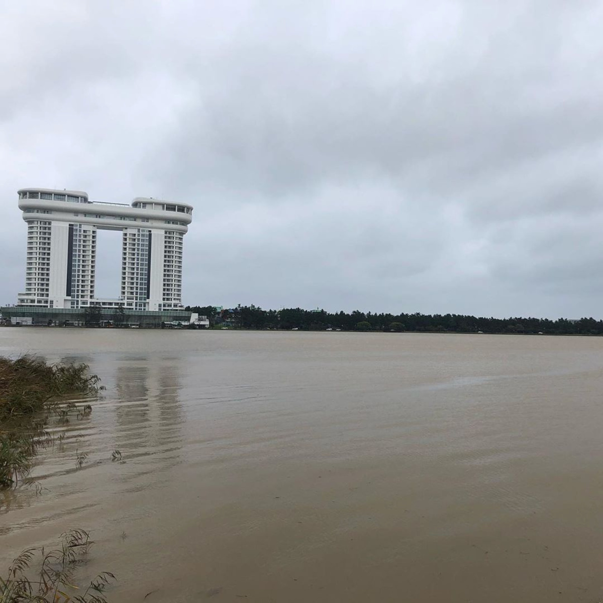 The Golden Tulip Skybay Hotel is pictured behind the Lake Gyeongpoho after Typhoon Mitag brought heavy rain and flood to Gangneung, South Korea, October 3, 2019, in this photo obtained from social media. @DIBIDIBOB/via REUTERS