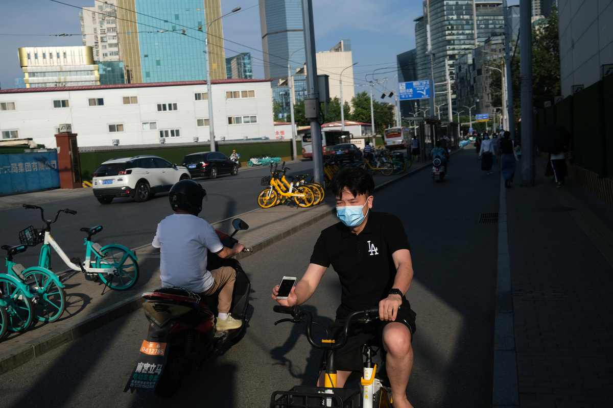 A man wearing a face mask rides a bicycle of the bike sharing service by Meituan, following the coronavirus disease (COVID-19) outbreak, in Beijing's central business area, China June 30, 2020. REUTERS/Tingshu Wang