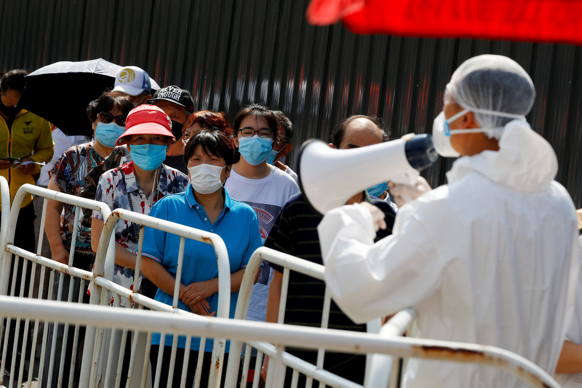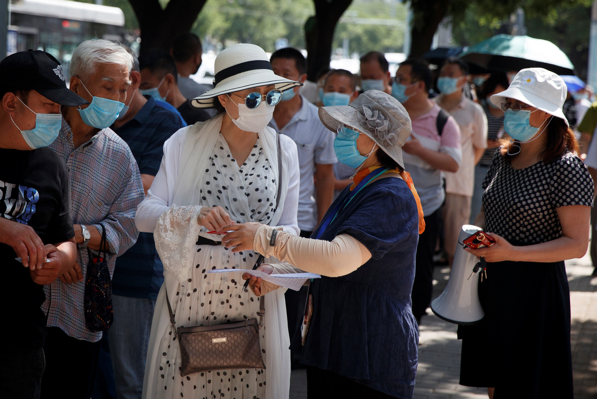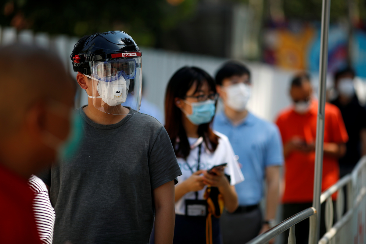 People line up to receive nucleic acid tests at a temporary testing site after a new outbreak of the coronavirus disease (COVID-19) in Beijing, China June 30, 2020. REUTERS/Thomas Peter