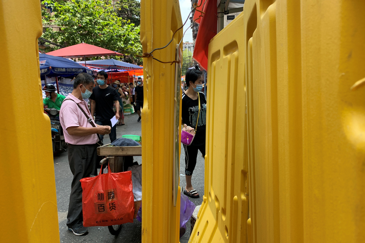 People wearing face masks are seen behind barricades at a market following the coronavirus disease (COVID-19) outbreak in Wuhan, Hubei province, China June 30, 2020. REUTERS/Xihao Jiang