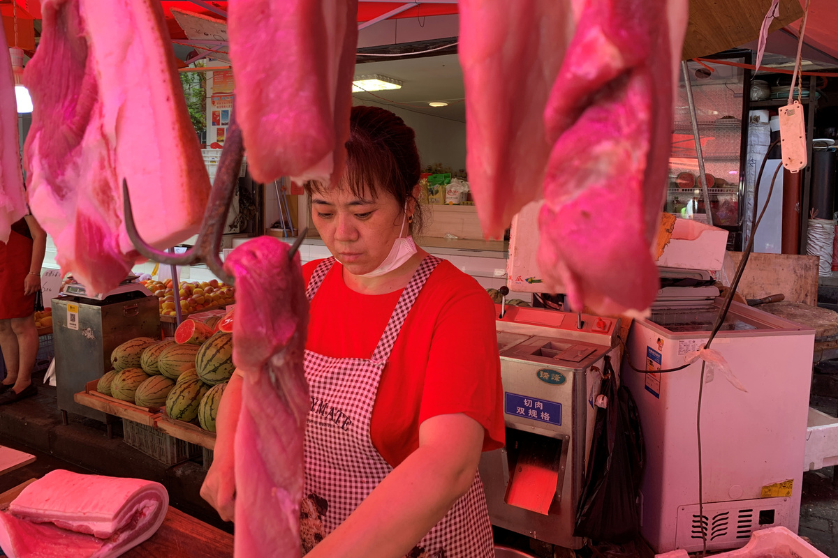A vendor is seen at a pork stall at a market following the coronavirus disease (COVID-19) outbreak in Wuhan, Hubei province, China June 30, 2020. REUTERS/Xihao Jiang