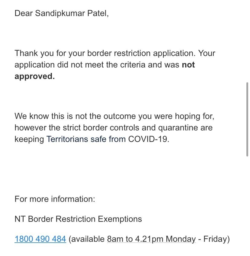 Yesterday he received an email from NT Health saying his application "did not meet the criteria and was not approved", but it did not explain the reasons for the decision.