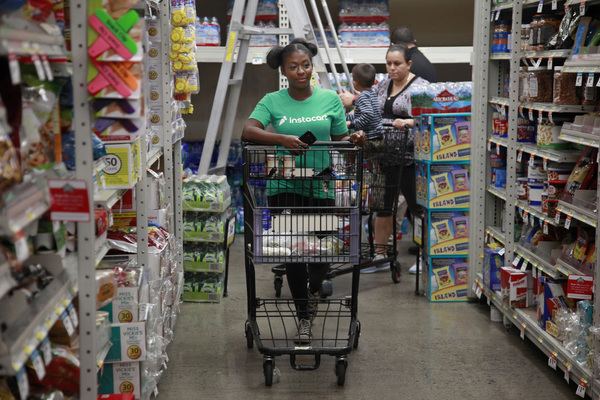 At a Bay Area Smart & Final store, Instacart full-service shopper La Tigre Waters wasted no time picking out bananas, asparagus and other items on a customer's shopping list.