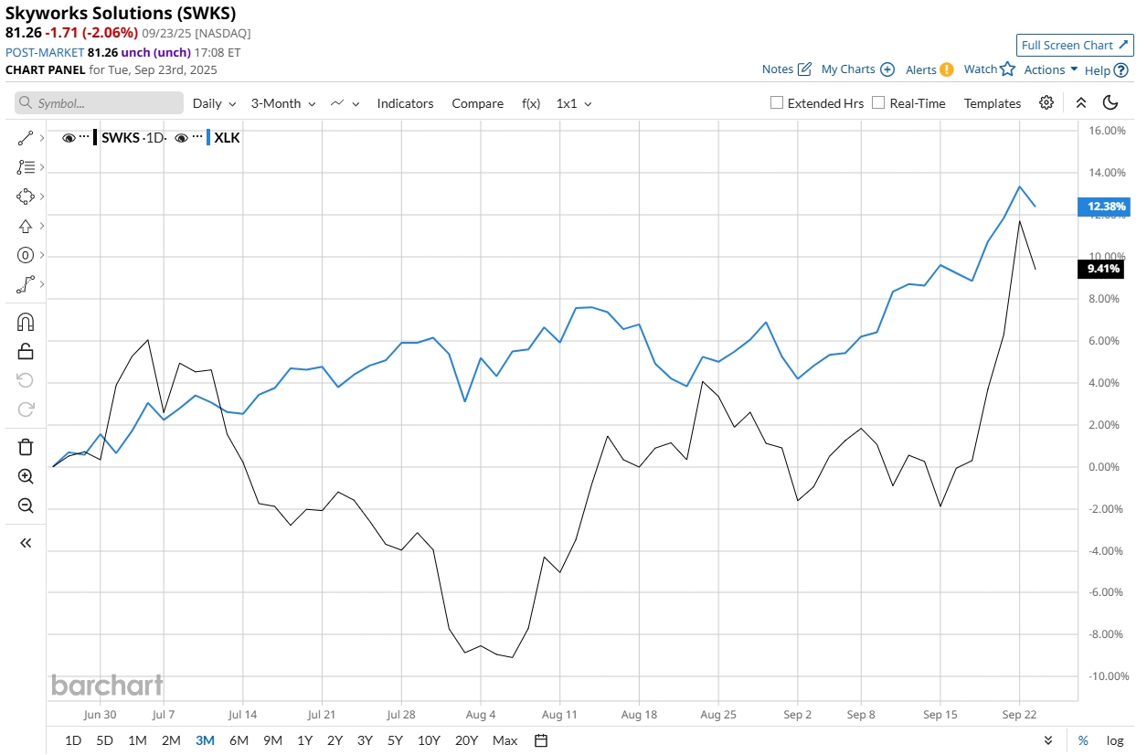 However, the chip company pulled back 19.9% from its 52-week high of $101.50, achieved last year. Shares of Skyworks have surged 12.3% over the past three months, compared to the Technology Select Sector SPDR Fund’s (XLK) 15.4% rise over the same time frame.