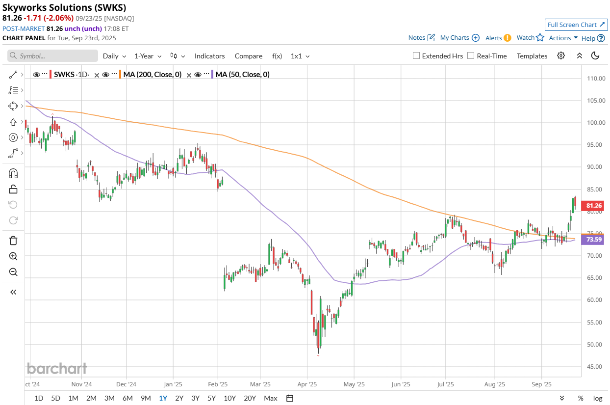 SWKS spent much of the past year in bearish momentum, stuck under its 200-day and mostly under its 50-day moving averages. Through spring and early summer, action looked mixed – brief pops but no real strength. Recently, though, momentum has turned bullish, with the stock breaking above both moving averages, signaling a possible shift after a long stretch of underperformance.