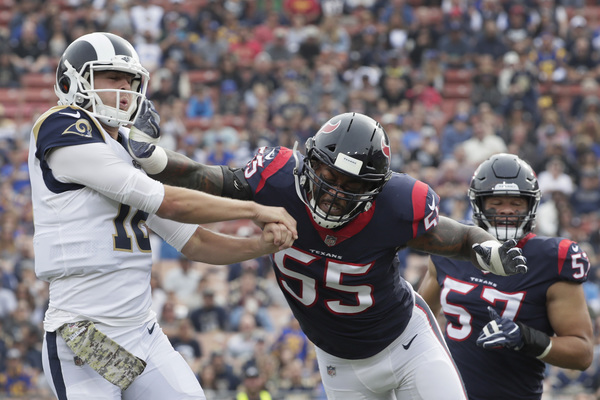 Los Angeles Rams quarterback JARED GOFF completed 25 of 37 passes (67.6 percent) for 355 yards with three touchdowns and no interceptions for a 125.4 passer rating in the Rams' 33-7 win over Houston. Goff, who passed for 311 yards with four touchdowns and no interceptions for a 146.8 passer rating last week, is the first player in franchise history to pass for at least 300 yards and three touchdowns with no interceptions in consecutive games. Goff threw a 94-yard touchdown pass to wide receiver Robert Woods which is the third-longest offensive play from scrimmage in franchise history,