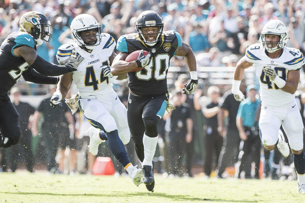 Jacksonville running back COREY GRANT rushed for a 56-yard touchdown � on a fake punt � on fourth down in the Jaguars' 20-17 overtime win against the Los Angeles Chargers. Grant, who had a 58-yard fourth-down run on a fake punt in Week 3, has two runs of at least 50 yards on fourth down this season, which is as many as all other active players have combined in their careers. Buffalo's LeSean McCoy and Kansas City's Albert Wilson each have one such run.