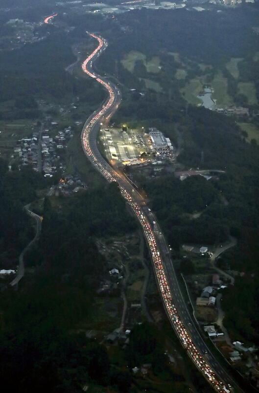 Traffic snarls along the Chuo Expressway in the direction of Tokyo, as seen near Uenohara, Yamanashi Prefecture, on Sunday. It is believed that many people were returning home from vacation destinations at the end of the first weekend since all states of emergency ended across the country.
