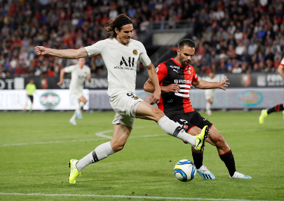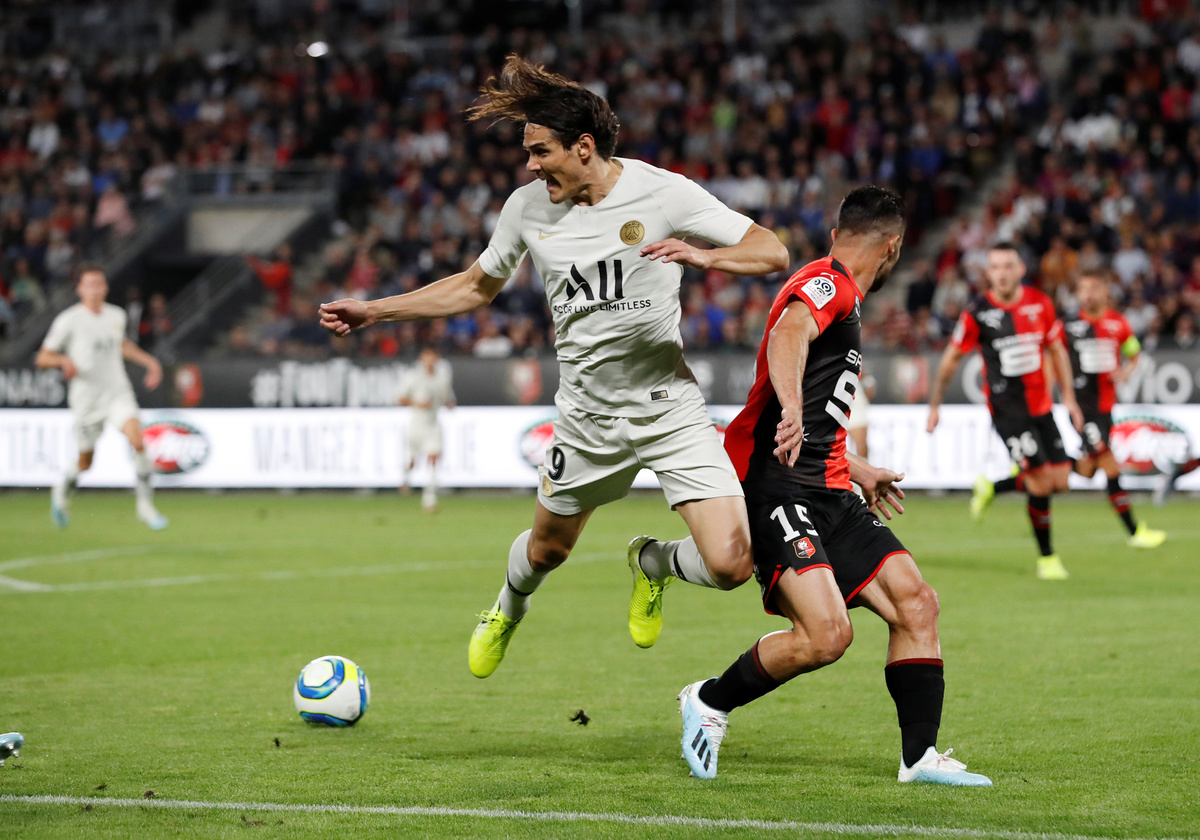 Soccer Football - Ligue 1 - Stade Rennes v Paris St Germain - Roazhon Park, Rennes, France - August 18, 2019 Paris St Germain's Edinson Cavani in action with Stade Rennes' Jeremy Morel REUTERS/Stephane Mahe