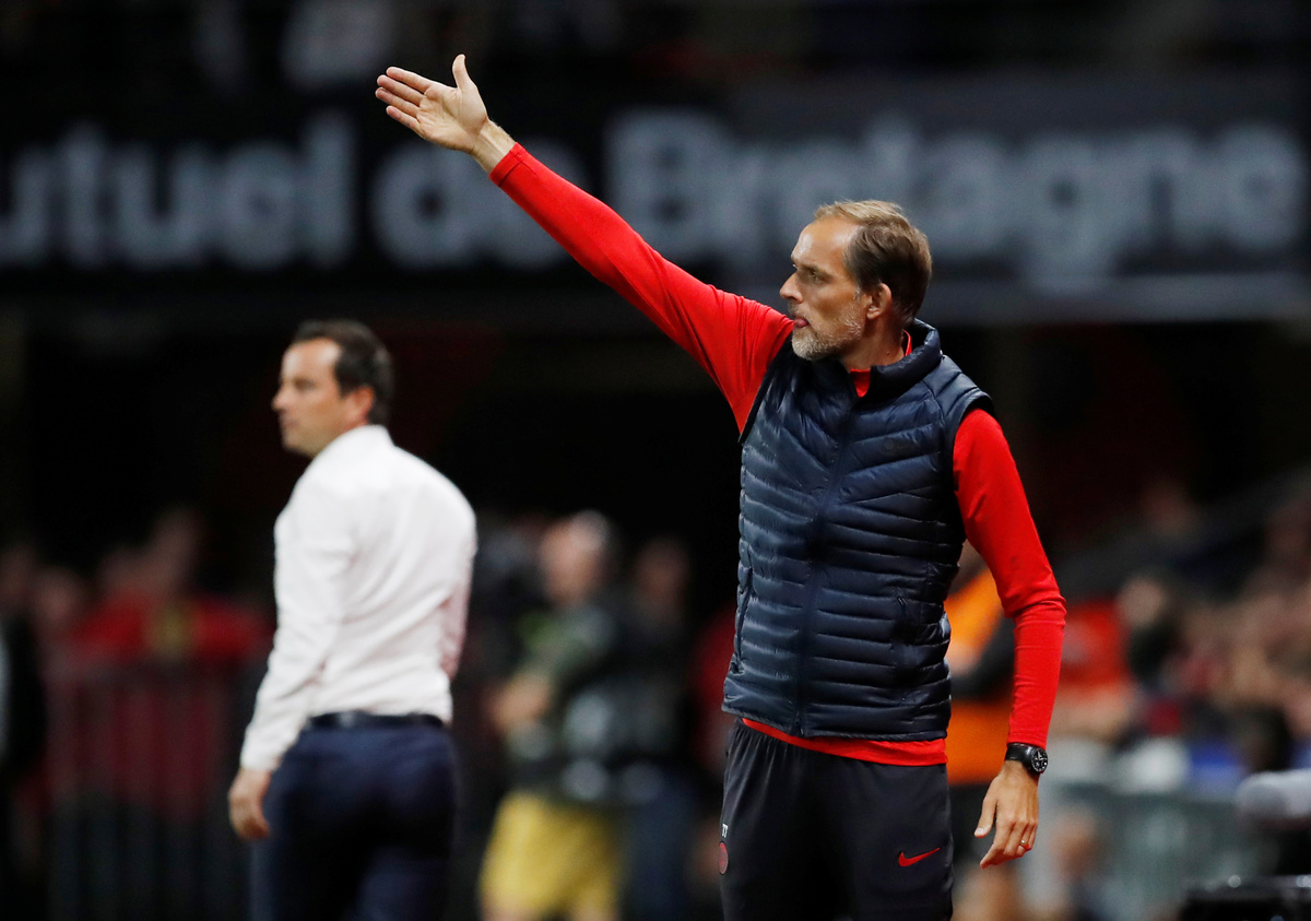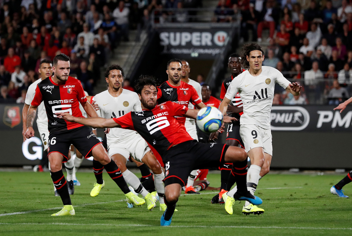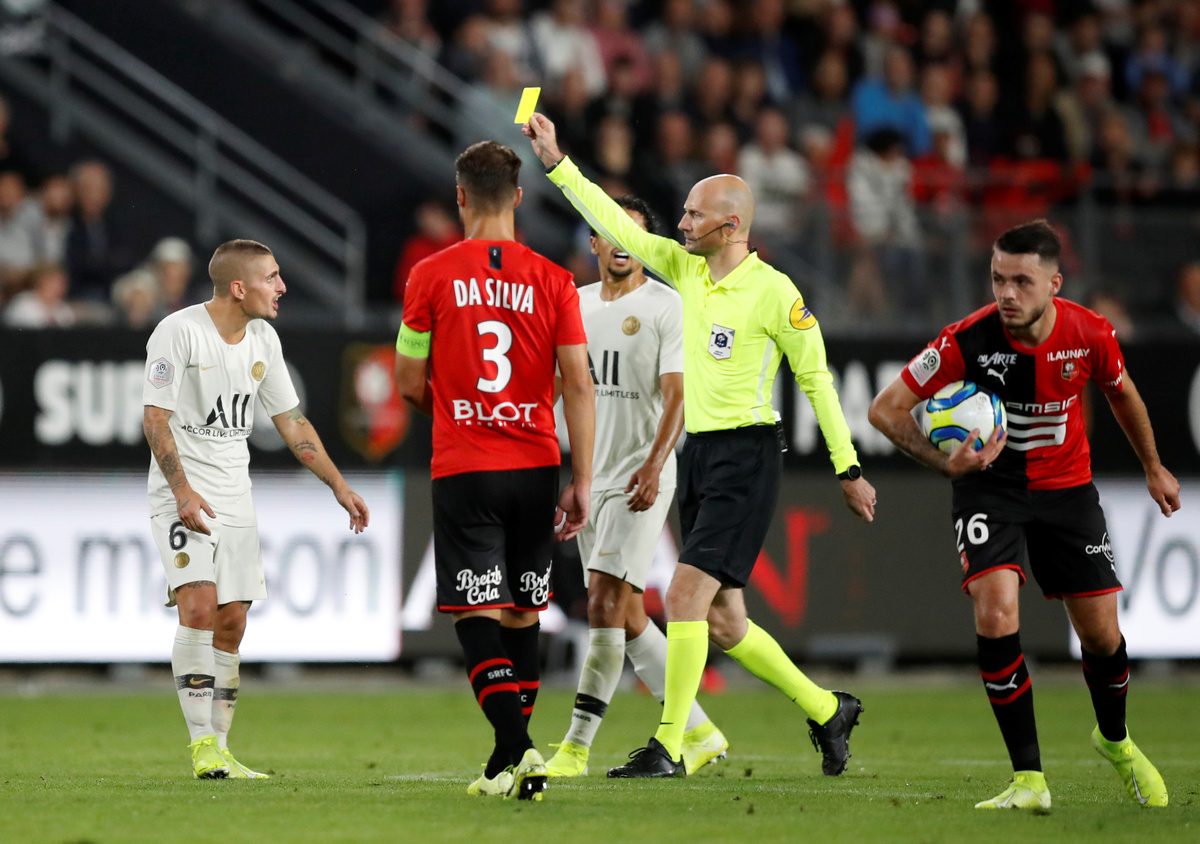 Soccer Football - Ligue 1 - Stade Rennes v Paris St Germain - Roazhon Park, Rennes, France - August 18, 2019 Paris St Germain's Marco Verratti is shown a yellow card by referee Antony Gautier REUTERS/Stephane MaheSoccer Football - Ligue 1 - Stade Rennes v Paris St Germain - Roazhon Park, Rennes, France - August 18, 2019 Paris St Germain's Edinson Cavani in action with Stade Rennes' Jeremy Morel REUTERS/Stephane MaheSoccer Football - Ligue 1 - Stade Rennes v Paris St Germain - Roazhon Park, Rennes, France - August 18, 2019 Stade Rennes' Romain Salin in action with Paris St Germain's Julian Draxler REUTERS/Stephane MaheSoccer Football - Ligue 1 - Stade Rennes v Paris St Germain - Roazhon Park, Rennes, France - August 18, 2019 Stade Rennes coach Julien Stephan celebrates with Eduardo Camavinga after the match REUTERS/Stephane MaheSoccer Football - Ligue 1 - Stade Rennes v Paris St Germain - Roazhon Park, Rennes, France - August 18, 2019 Paris St Germain coach Thomas Tuchel gestures REUTERS/Stephane MaheSoccer Football - Ligue 1 - Stade Rennes v Paris St Germain - Roazhon Park, Rennes, France - August 18, 2019 Stade Rennes' Romain Del Castillo celebrates in front of fans after the match REUTERS/Stephane MaheSoccer Football - Ligue 1 - Stade Rennes v Paris St Germain - Roazhon Park, Rennes, France - August 18, 2019 Paris Saint-Germain chairman and CEO Nasser Al-Khelaifi in the stands before the match REUTERS/Stephane Mahe