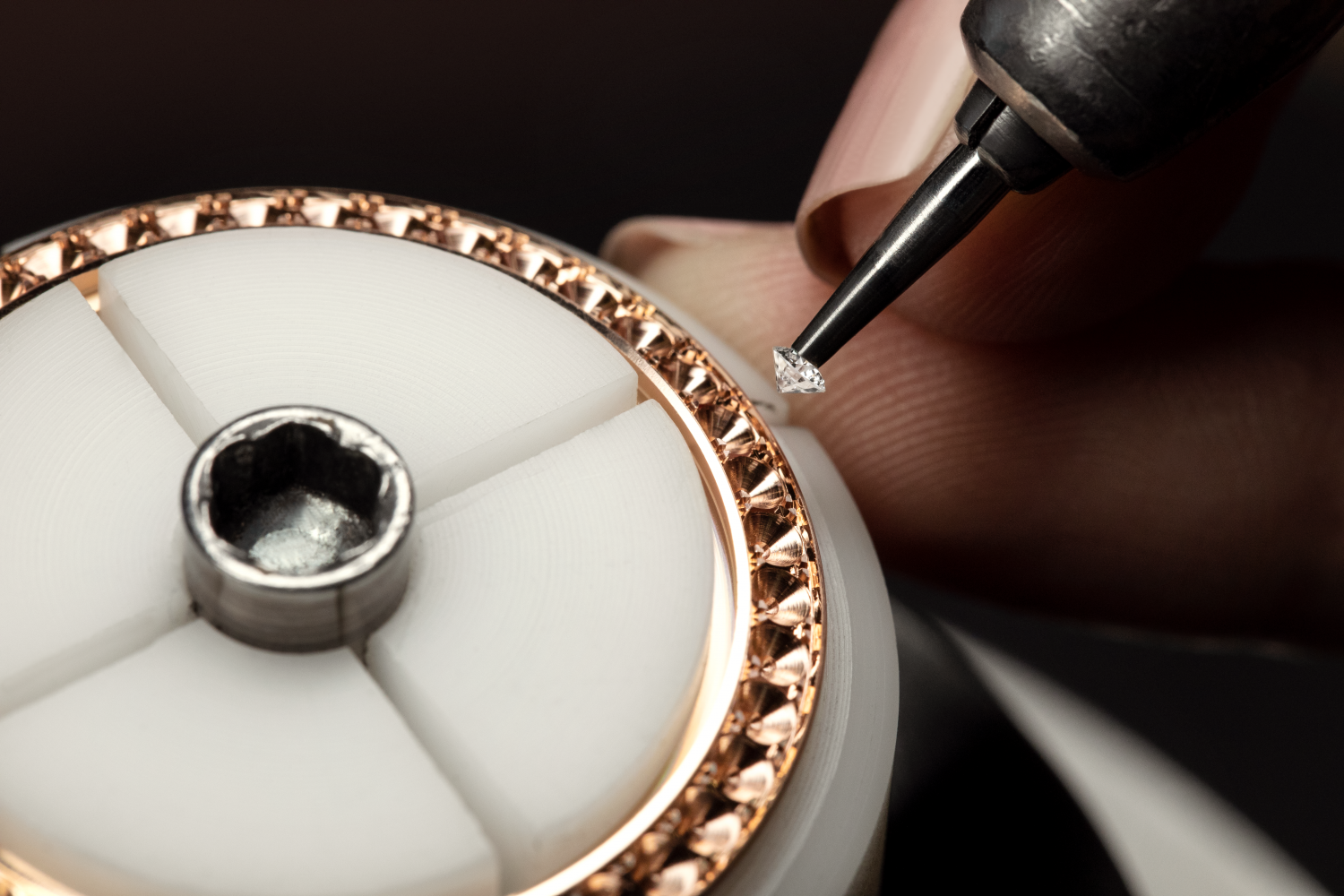 The diamonds are then precisely aligned one by one so that their facets reflect the light in unison. The gemsetters then push back the beads formed from the precious metal over the gems to hold them in place. They then manually work the separation between the beads with great accuracy to avoid damaging the stones.