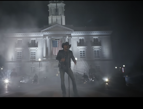 The courthouse was used as a backdrop with an American flag in that video. Though no mention of race occurs in the song, the racial overtones are there, as the lyrics boldly smack of modern-day, big-city crime against old-fashioned, small-city values: