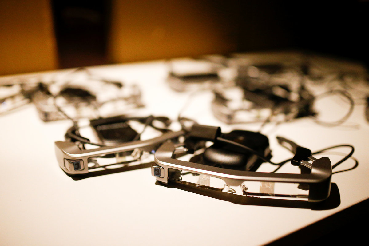 Pairs of smart caption glasses designed by Epson, at the National Theatre in London, Britain, October 3, 2018. REUTERS/Henry Nicholls