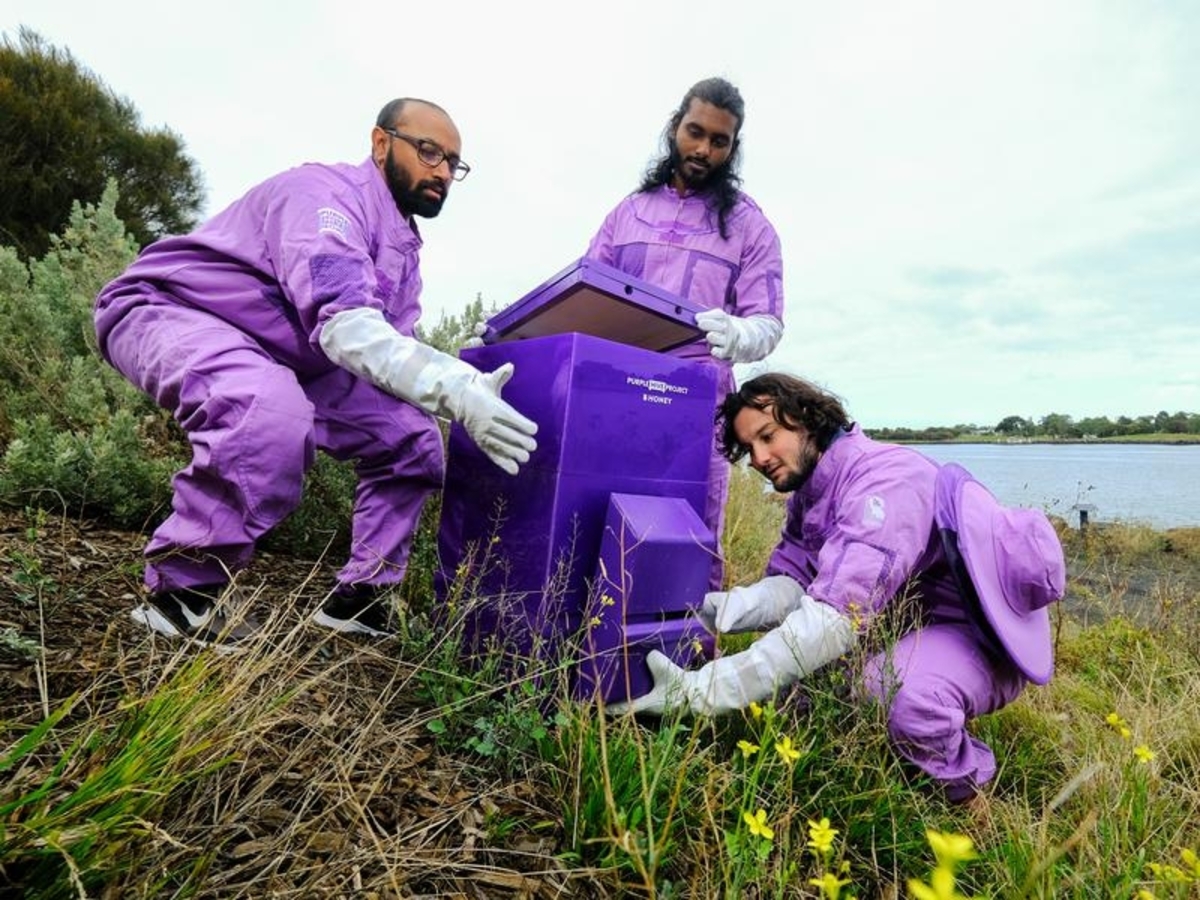 Purple Hive was launched on Monday at the Port of Melbourne. The solar-powered device detects Varroa destructor, a mite that feeds on honey bees.