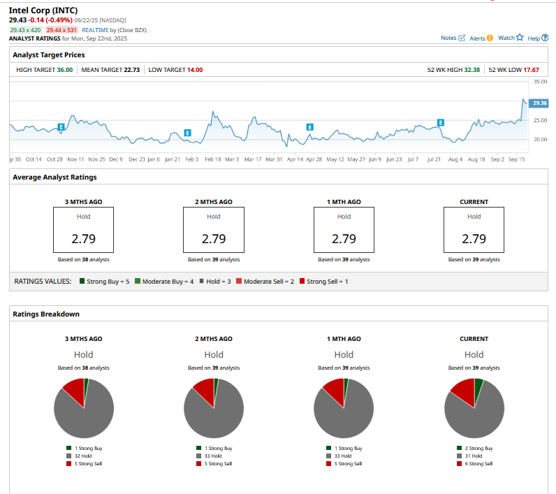 Several analysts have raised Intel’s target price over the last month. Looking at the most notable ones, UBS raised its estimate from $25 to $35 while Barclays revised its from $19 to $25. However, Citi and Benchmark have conflicting opinions over INTC, and while the former downgraded the stock to a “Sell” equivalent, Benchmark upgraded Intel to a “Buy,” raising its target price to a Street-high of $43.