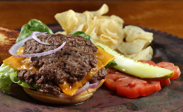 Here's how to work the equation: Divide ground beef by two, roll each half into a sphere and, in a hot pan, smash with a spatula. The flattened patty plane browns to a sizzle on side A, sizzle on side B _ no middle. Stack patty 1 on patty 2, sandwiching a slice of American cheese.