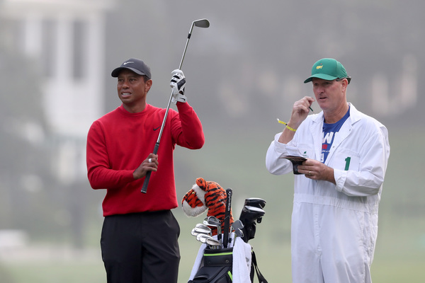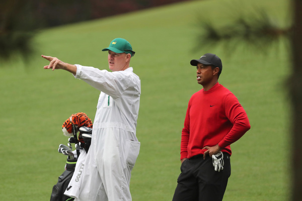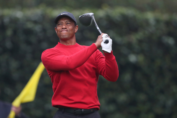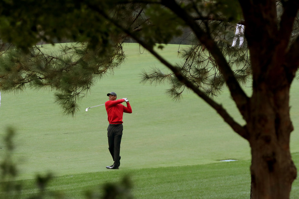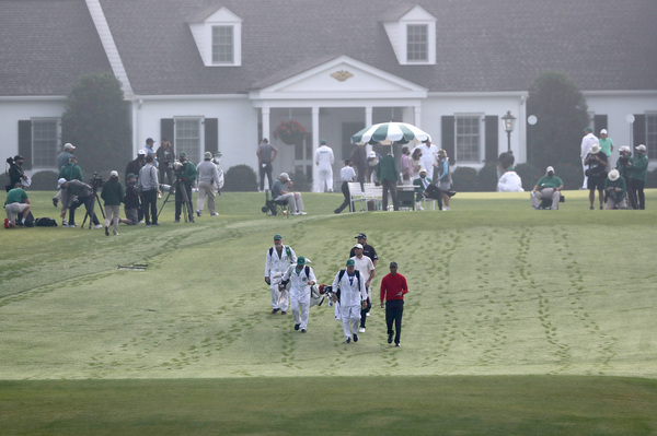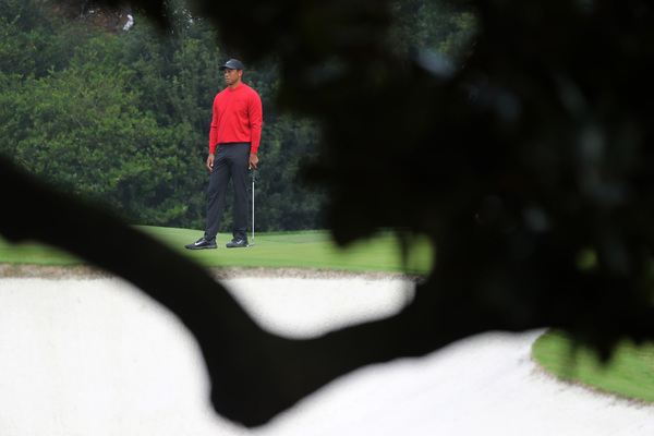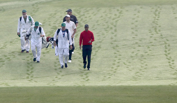Tiger Woods, right, Scottie Scheffler (white shirt) and Shane Lowry (black shirt) walk down the first fairway, leaving footprints in the grass as Butler Cabin is shown in the background, during the final round of the Masters Sunday, Nov. 15, 2020 at Augusta National in Augusta, Georgia. (Curtis Compton/Atlanta Journal-Constitution/TNS)