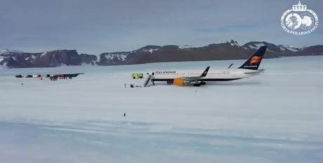 The Icelandair jet was chartered to bring home 30 Norwegian researchers working at the Troll Research Station in Dronning Maud Land, Antarctica.