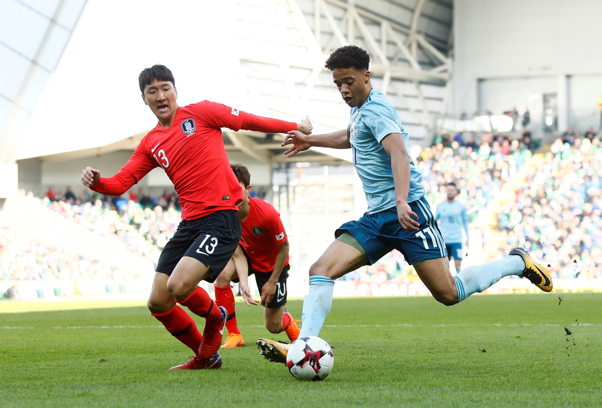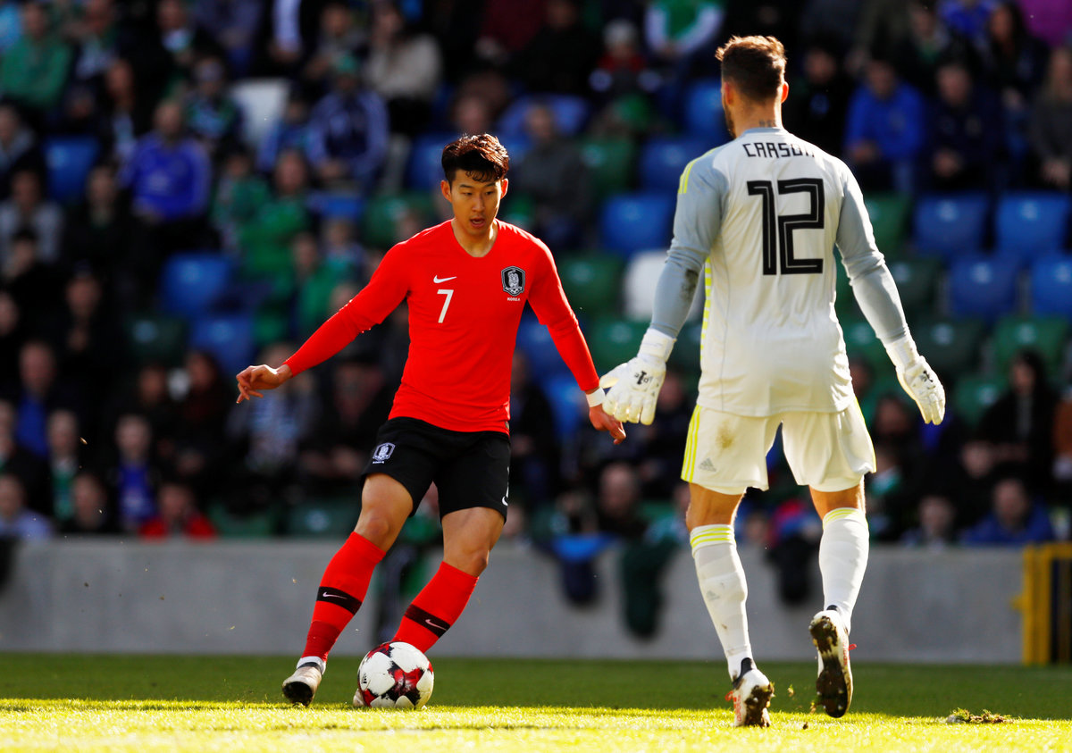 Soccer Football - International Friendly - Northern Ireland vs South Korea - National Football Stadium at Windsor Park, Belfast, Britain - March 24, 2018 South Korea's Son Heung-Min Action Images via Reuters/Jason CairnduffSoccer Football - International Friendly - Northern Ireland vs South Korea - National Football Stadium at Windsor Park, Belfast, Britain - March 24, 2018 South Korea’s Lee Yong in action with Northern Ireland’s Jordan Jones Action Images via Reuters/Jason CairnduffSoccer Football - International Friendly - Northern Ireland vs South Korea - National Football Stadium at Windsor Park, Belfast, Britain - March 24, 2018 Northern Ireland’s Jamal Lewis in action with South Korea’s Woo-Young Jung Action Images via Reuters/Jason CairnduffSoccer Football - International Friendly - Northern Ireland vs South Korea - National Football Stadium at Windsor Park, Belfast, Britain - March 24, 2018 South Korea's Son Heung-Min in action with Northern Ireland’s Trevor Carson Action Images via Reuters/Jason Cairnduff