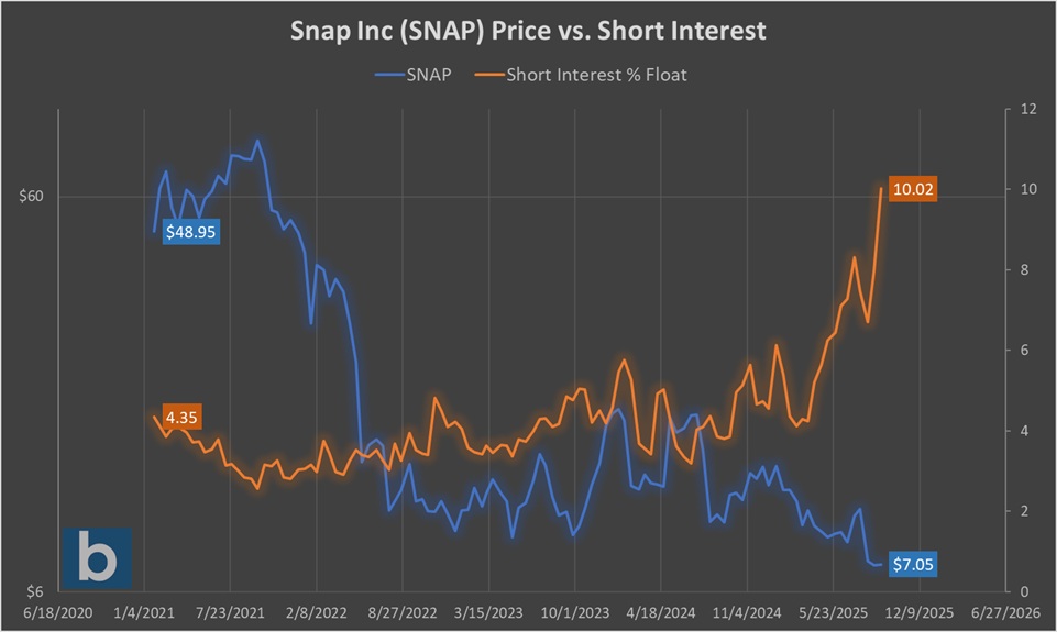 Between late January 2021 and early September 2025, the correlation coefficient between the SNAP stock price and its short interest was -43.53%. Basically, as the price fell, short interest moved higher. However, since June of last year, the correlation coefficient clocked in at -60.43%, with the magnitude of the inverse relationship strengthening in recent years.