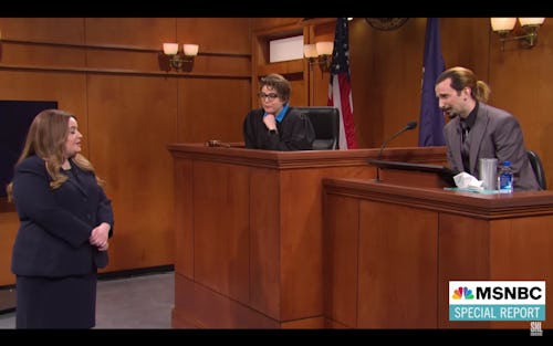 Kate McKinnon opens the sketch as a news anchor introducing the segment. She deadpans, “With all the problems in the world, isn't it nice to have a news story we can all collectively watch and say, ‘Glad it ain't me?’” In the sketch, video footage has been found related to the infamous incident when Heard allegedly defecated in Depp’s bed (she maintains the feces was actually from the dog). In the fake security footage, members of Depp’s house staff all slowly discover the feces, while the judge, played by Cecily Strong, gets a kick out of it in the courtroom. As Aidy Bryant, playing Depp’s lawyer, introduces the tape, Strong quips, “I’ll allow it, because it does sound fun — and this trial is for fun.”