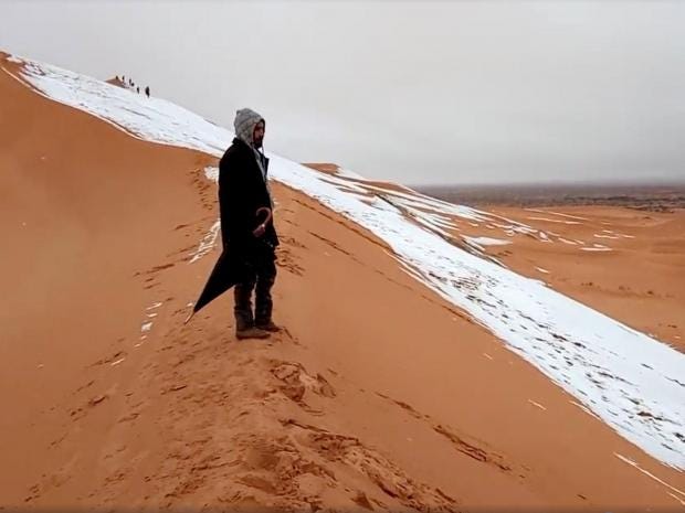 Snow has fallen in the Sahara, covering desert dunes in a layer up to 16 inches deep.