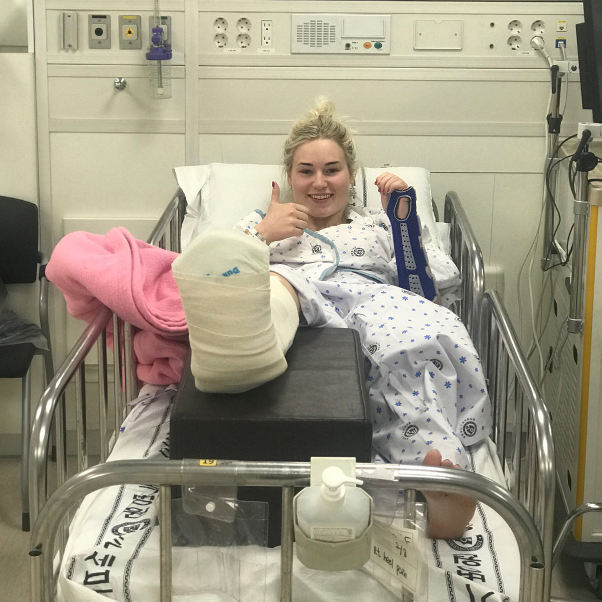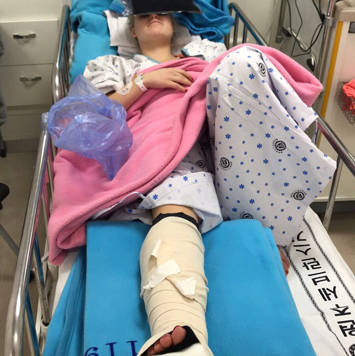 British snowboarder Katie Ormerod is seen in hospital after fracturing her wrist and heel in training, in Seoul, South Korea, February 9, 2018. REUTERS/Instagram/Omerodkatie