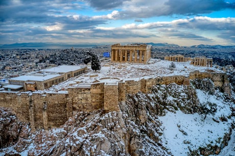The Athens snowstorm, described by authorities as the most severe in 20 years, blanketed the city and its ancient monuments Tuesday and left parts of the capital without power and water.