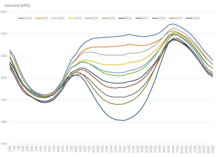 The impact on grid-based electricity demand in South Australia is shown in the chart below. It is clear that over the past ten years, grid demand in the middle of the day has fallen substantially due to the impact of solar, making it very hard for inflexible older coal plants to compete.