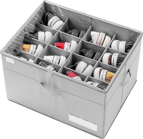 This shoe organizer bin holds up to 16 pairs of sneakers, flats, sandals, or slippers in a compact, stackable cube, so it’s one of the most space-savvy ways to store your footwear collection. Its reinforced handles, dual zippers, transparent plastic lid, and vertical filing system make retrieval a breeze and let you see all of your shoes at once.