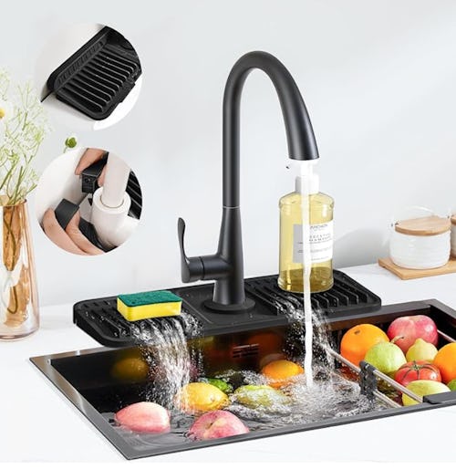 Get rid of soapy sink-side grime once and for all. This kitchen sink mat wraps around most single-hole faucets to protect your countertop, store your soap and sponges, and automatically drain any moisture back into the sink. Since it’s made from silicone, it’s flexible and easy to rinse clean, plus you can cut the collar as needed to fit your faucet.