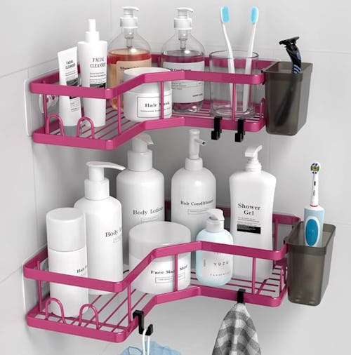 Designed to fit in tight corners, these L-shaped shower caddies get bottles off your floor and bathtub rim. They’re made from rust-resistant metal and stick to the tiles using adhesive strips for drill-free installation. In addition to their self-draining wire shelves, they also have hooks and cups to hold washcloths, loofahs, toothbrushes, razors, and other hygiene essentials.