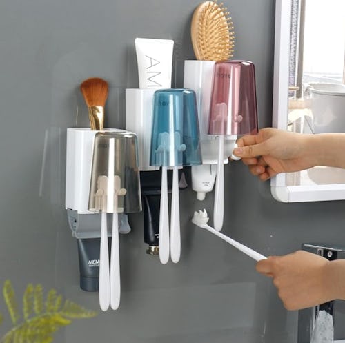 Reviewers have called these wall-mounted toothbrush holders a “game changer for bathroom organization” and a “great value for the money.” They stick to most surfaces with strong adhesive strips, hold up to two toothbrushes each behind a splash-resistant shield, and have built-in toothpaste dispensers that squeeze out every last bit. This set also comes with cups to hold brushes, razors, toiletries, and more.