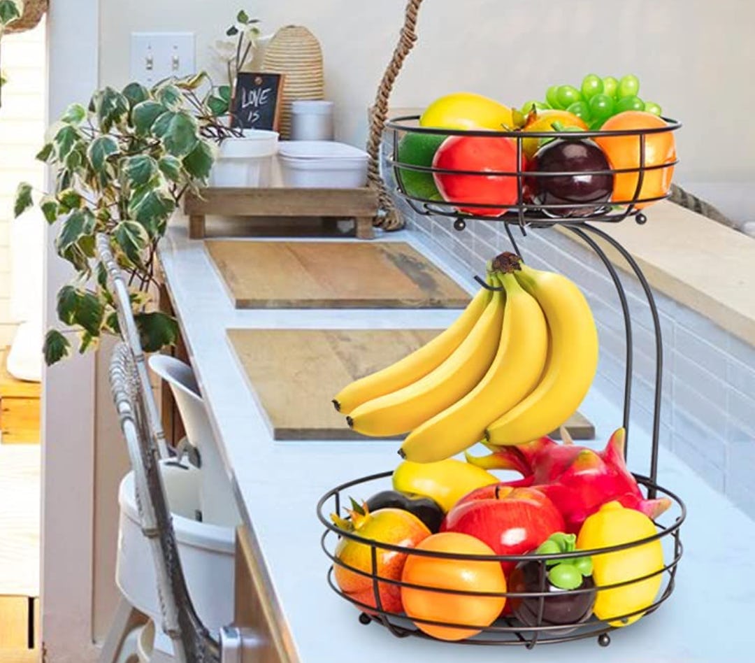 This two-tiered fruit basket is everything you need when it comes to storing your fresh fruit so it ripens easily, provides a bit of colorful kitchen decor, and makes snacking on fruit tempting. The lower level is perfect for apples, oranges, and other large fruits. A hook hangs under the upper basket so bananas ripen evenly. And the top basket lets you keep smaller goods.