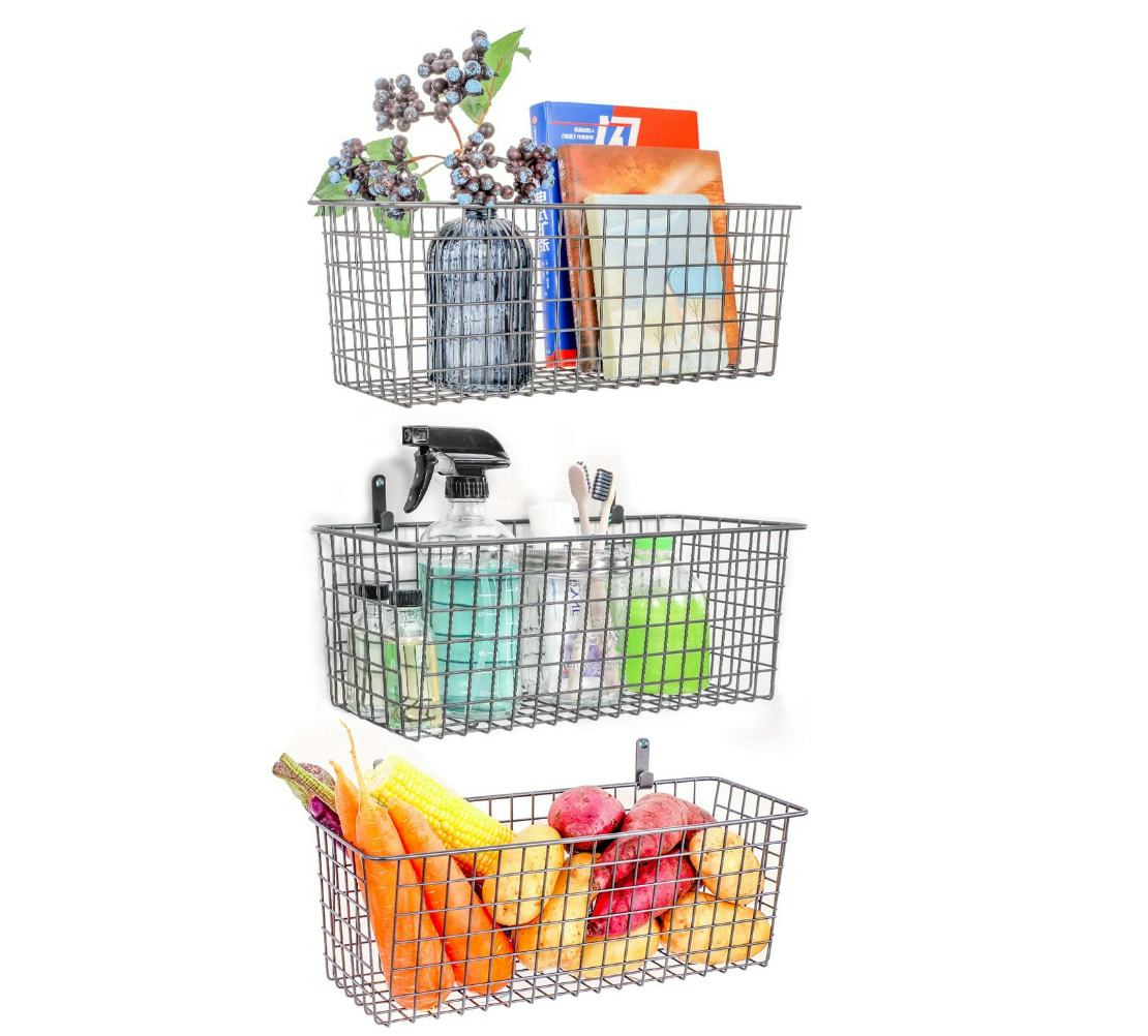 These hanging wall baskets are the solution to many challenging storage problems. Mount them to a wall, cupboard, or in the pantry and they offer a handy place to drop everything from personal care items in the bathroom to apples and potatoes in the kitchen. They are roomy and have hooks for mounting to the wall.