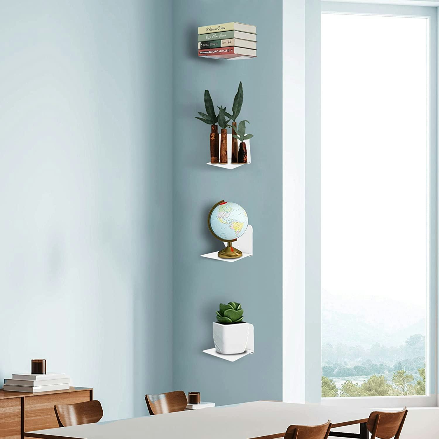 These floating bookshelves are the slickest way to display a collection of books, keep your to-be-read pile handy but off the bedside table, or turn your massive book collection into wall art. Mount the shelves to the wall and install one book on the bottom to form a base. Then stack things on top of that book. You can create a literary art statement or use a few books as a shelf to hold a plant or candle.