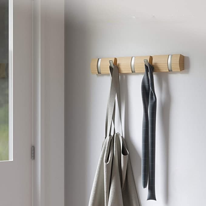 If clutter tends to congregate at the first flat surface near your entryway, the solution is easy, fast, and looks good: this low-profile coat rack with retractable hooks. When you walk in the door, pop out one of the hooks and hang your jacket, bag, or keys there. Not only will your clutter become part of the decor but you will know where to find everything when you are leaving the house. You can choose the number of hooks, size, and color so it matches your vibe.