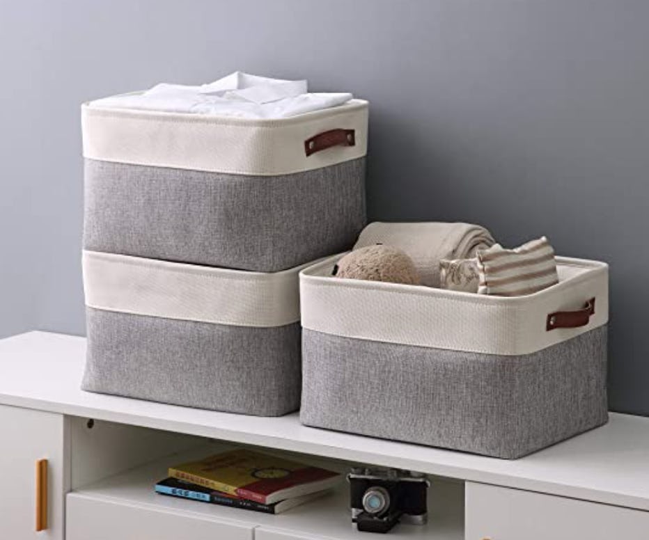 Storage baskets — like this three-pack of linen storage bins with leather handles — are a great way to bring order to a closet, playroom, or office. Put like items in a bin so you can grab that bin and bring it out when you are looking for shirts, toys, power cords, or whatever is in that bin. When stored, your clutter looks neat and orderly. And you will be able to find what you need when you want it.