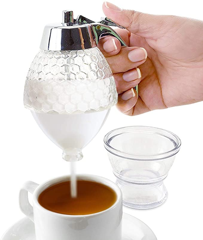 Make the morning easier by filling this sugar dispenser with your favorite sweetener. You can sweeten your coffee or tea simply by pulling the trigger to start the bottom dispenser pouring and releasing it to stop. No more dipping a wet spoon into the sugar bowl. The beehive-shaped dispenser sits in a bowl that holds it upright and catches any spills. And it works just as well with liquids like honey or maple syrup.