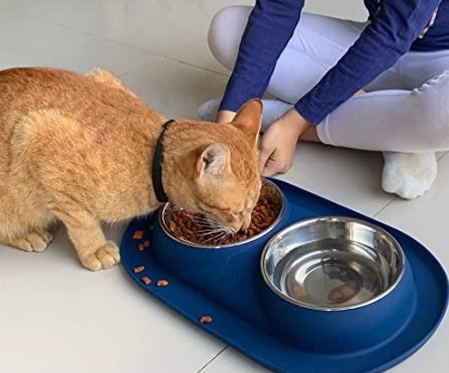 These two stainless steel pet bowls with a base have a raised rim so that water and dropped kibble land in the tray rather than scattering all over the floor. Your kitchen will stay so much cleaner. Each bowl holds 12 ounces, which is the perfect size for small dogs and cats. The base keeps the bowls from sliding around, too, so your pet will be less frustrated. And it all cleans up super easily.