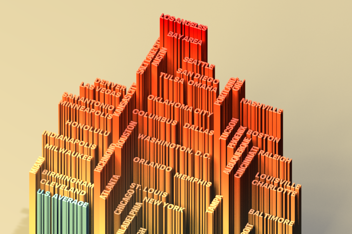 Nationwide, the average new-home mortgage payment is now 52% higher than the average monthly rent. And for many buyers, even that figure is misleadingly low, since it reflects lower prices in rural areas and small towns. In the major metro areas where business is concentrated, the premium attached to buying is far higher. In this graphic, the taller a city’s name, the higher the relative cost of ownership: It’s an apt metaphor for an investment that’s a bigger stretch than ever.