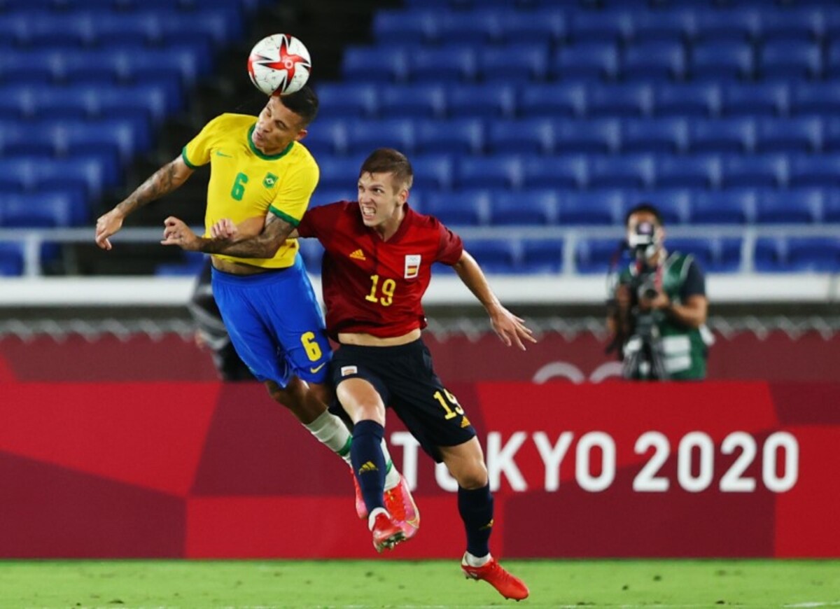 Tokyo 2020 Olympics - Soccer Football - Men - Gold medal match - Brazil v Spain - International Stadium Yokohama, Yokohama, Japan - August 7, 2021. Guilherme Arana of Brazil in action with Dani Olmo of Spain. REUTERS/Amr Abdallah Dalsh
