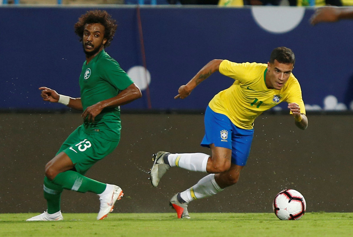 Soccer Football - International Friendly - Saudi Arabia v Brazil - King Saud University Stadium, Riyadh, Saudi Arabia - October 12, 2018 Brazil's Philippe Coutinho in action with Saudi Arabia's Yaseer Al-Shahrani REUTERS/Faisal Al Nasser
