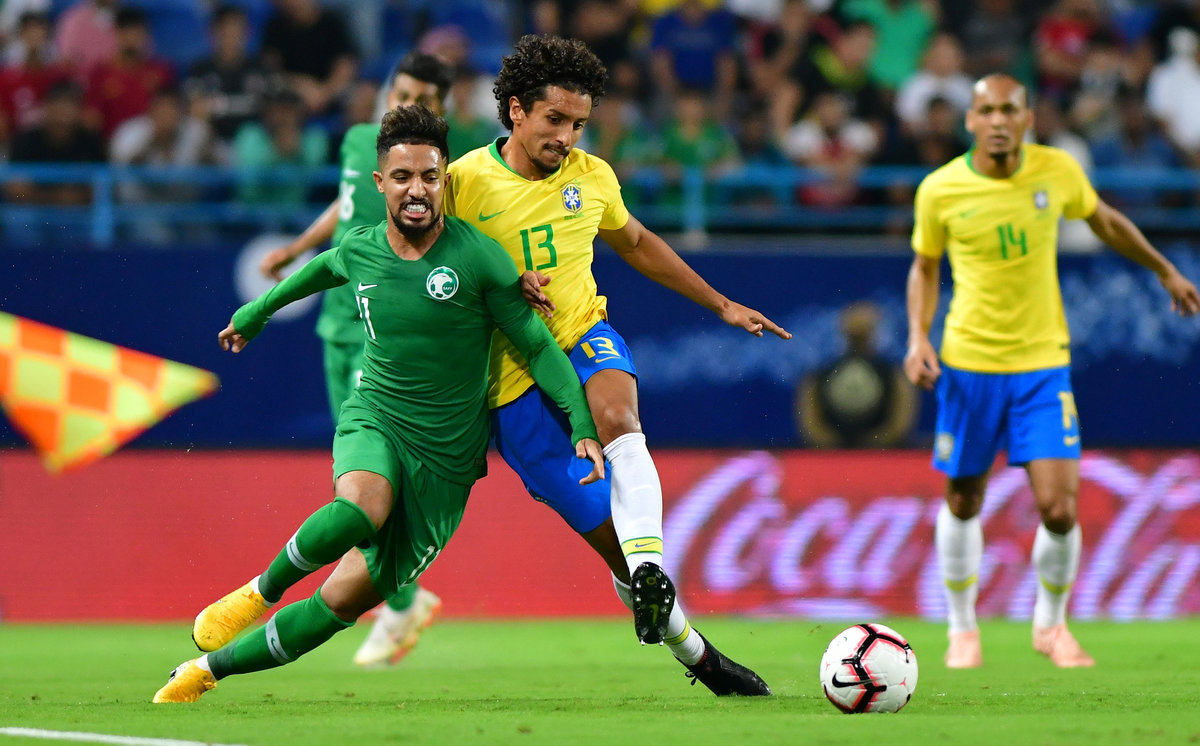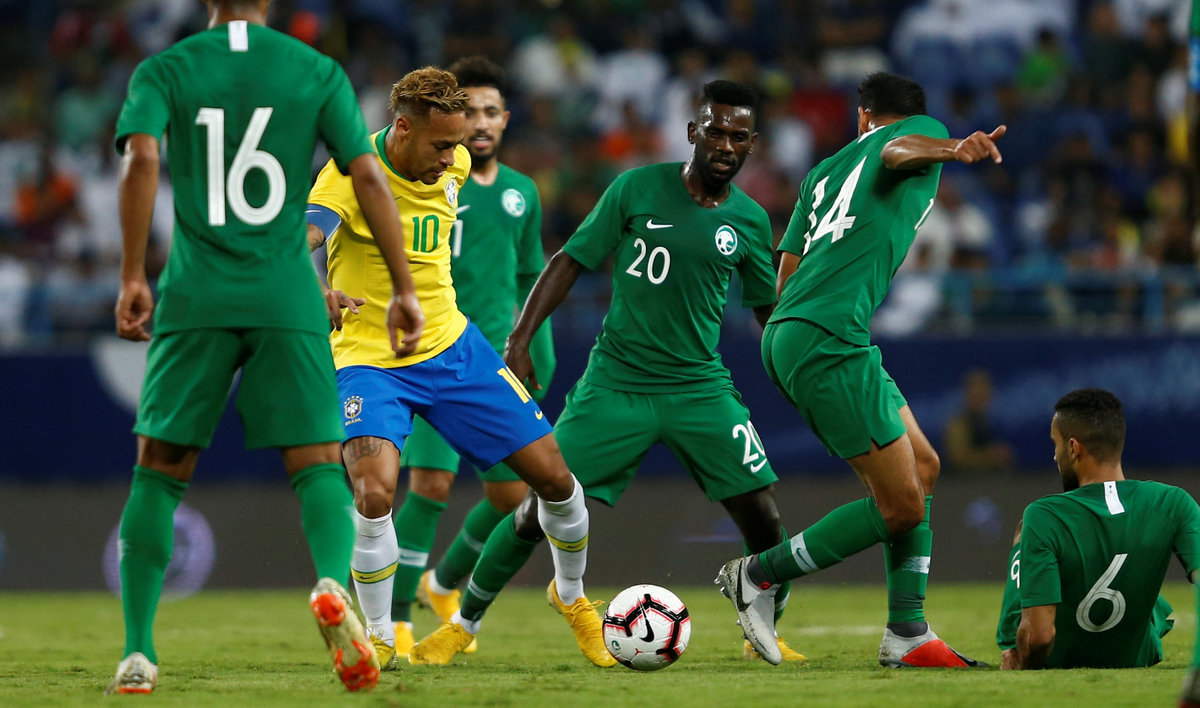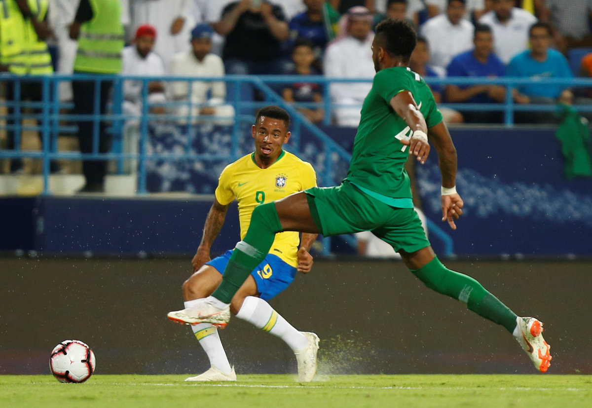 Soccer Football - International Friendly - Saudi Arabia v Brazil - King Saud University Stadium, Riyadh, Saudi Arabia - October 12, 2018 Brazil's Neymar in action with Saudi Arabia's Abdulaziz Al-Bishi and Abdullah Otayf REUTERS/Faisal Al NasserSoccer Football - International Friendly - Saudi Arabia v Brazil - King Saud University Stadium, Riyadh, Saudi Arabia - October 12, 2018 Brazil's Gabriel Jesus in action with Saudi Arabia's Abdulaziz Al-Bishi REUTERS/Faisal Al NasserSoccer Football - International Friendly - Saudi Arabia v Brazil - King Saud University Stadium, Riyadh, Saudi Arabia - October 12, 2018 Brazil's Neymar in action with Saudi Arabia's Abdullah Otayf REUTERS/Faisal Al NasserSoccer Football - International Friendly - Saudi Arabia v Brazil - King Saud University Stadium, Riyadh, Saudi Arabia - October 12, 2018 Brazil's Gabriel Jesus in action REUTERS/Faisal Al NasserSoccer Football - International Friendly - Saudi Arabia v Brazil - King Saud University Stadium, Riyadh, Saudi Arabia - October 12, 2018 Saudi Arabia fans inside the stadium REUTERS/Waleed AliSoccer Football - International Friendly - Saudi Arabia v Brazil - King Saud University Stadium, Riyadh, Saudi Arabia - October 12, 2018 Brazil's Marquinhos in action with Saudi Arabia's Hatan Babhir REUTERS/Waleed Ali