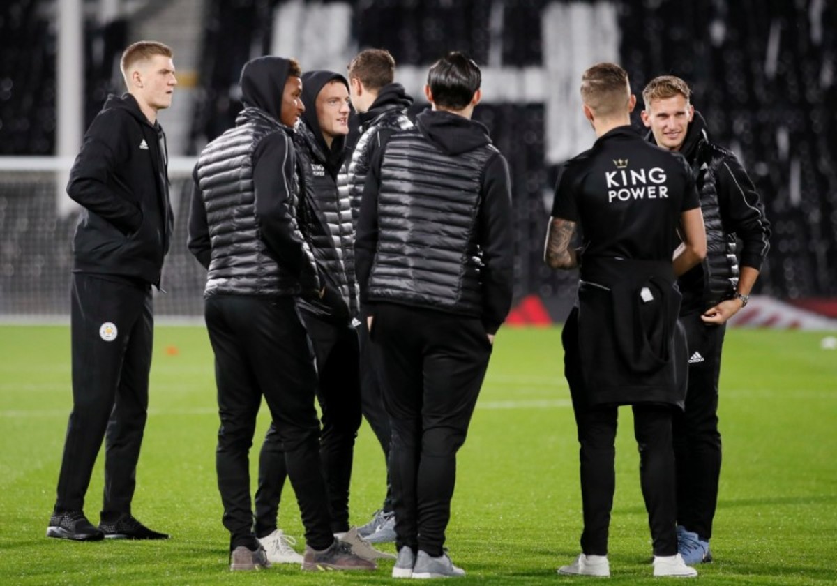 Soccer Football - Premier League - Fulham v Leicester City - Craven Cottage, London, Britain - December 5, 2018 Leicester City's Demarai Gray, Jamie Vardy, Marc Albrighton and team mates on the pitch before the match REUTERS/David Klein