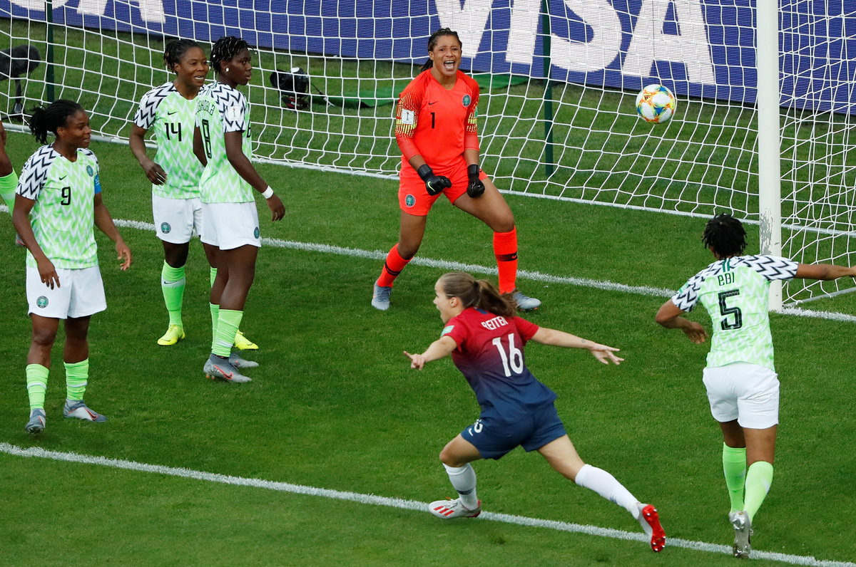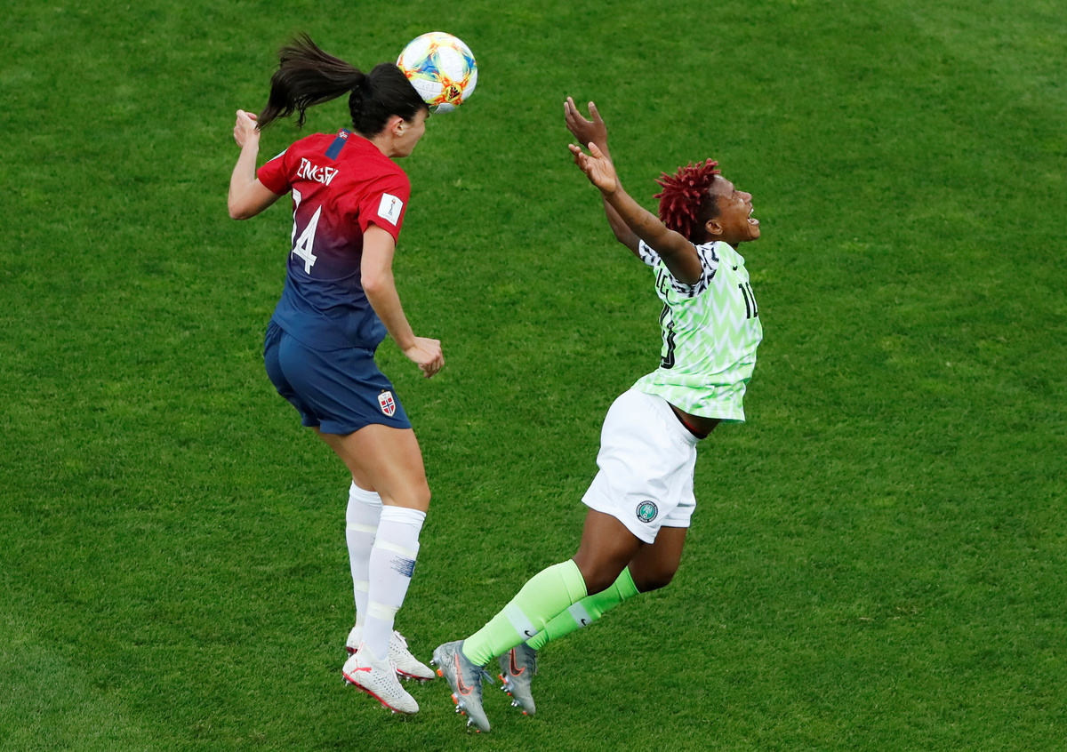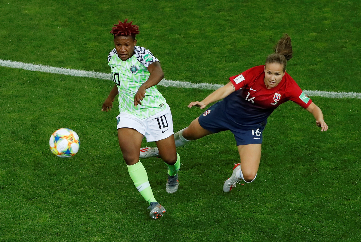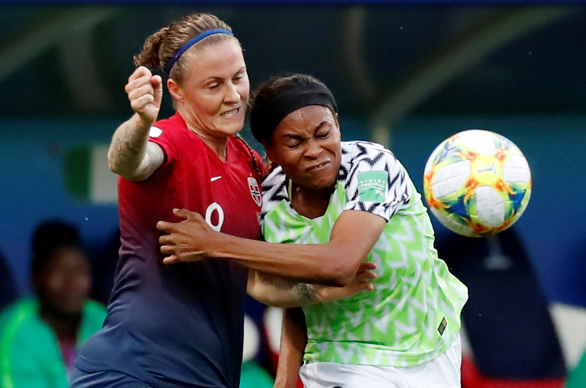 Soccer Football - Women's World Cup - Group A - Norway v Nigeria - Stade Auguste-Delaune, Reims, France - June 8, 2019 Nigeria's Rita Chikwelu in action with Norway's Guro Reiten REUTERS/Gonzalo FuentesSoccer Football - Women's World Cup - Group A - Norway v Nigeria - Stade Auguste-Delaune, Reims, France - June 8, 2019 Norway's Ingrid Syrstad Engen in action with Nigeria's Rita Chikwelu REUTERS/Gonzalo FuentesSoccer Football - Women's World Cup - Group A - Norway v Nigeria - Stade Auguste-Delaune, Reims, France - June 8, 2019 Nigeria's Faith Michael reacts REUTERS/Christian HartmannSoccer Football - Women's World Cup - Group A - Norway v Nigeria - Stade Auguste-Delaune, Reims, France - June 8, 2019 Nigeria's Francisca Ordega in action REUTERS/Gonzalo FuentesSoccer Football - Women's World Cup - Group A - Norway v Nigeria - Stade Auguste-Delaune, Reims, France - June 8, 2019 Norway's Lisa-Marie Utland scores their second goal REUTERS/Gonzalo FuentesSoccer Football - Women's World Cup - Group A - Norway v Nigeria - Stade Auguste-Delaune, Reims, France - June 8, 2019 Norway's Lisa-Marie Utland celebrates scoring their second goal with Isabell Herlovsen REUTERS/Christian HartmannSoccer Football - Women's World Cup - Group A - Norway v Nigeria - Stade Auguste-Delaune, Reims, France - June 8, 2019 Nigeria's Osinachi Ohale scores an own goal and Norway's third REUTERS/Gonzalo FuentesSoccer Football - Women's World Cup - Group A - Norway v Nigeria - Stade Auguste-Delaune, Reims, France - June 8, 2019 Nigeria's Osinachi Ohale looks dejected after scoring an own goal for Norway's third as Norway's Lisa-Marie Utland celebrates REUTERS/Christian HartmannSoccer Football - Women's World Cup - Group A - Norway v Nigeria - Stade Auguste-Delaune, Reims, France - June 8, 2019 Norway's Lisa-Marie Utland celebrates scoring their second goal with team mates REUTERS/Christian Hartmann
