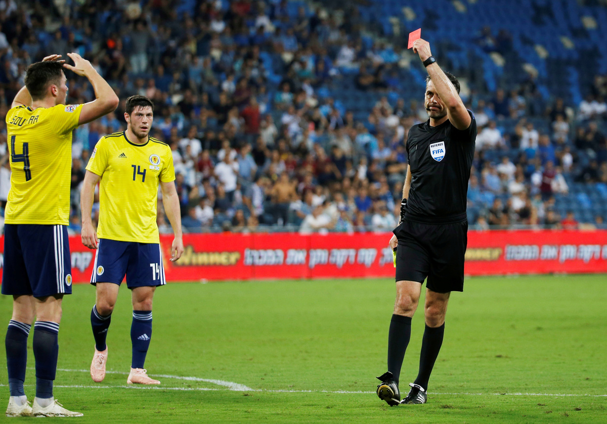 Soccer Football - UEFA Nations League - League C - Group 1 - Israel v Scotland - Sammy Ofer Stadium, Haifa, Israel - October 11, 2018 Scotland's Jon Soutattar in action with Israel's Moanes Dabour REUTERS/Ronen ZvulunSoccer Football - UEFA Nations League - League C - Group 1 - Israel v Scotland - Sammy Ofer Stadium, Haifa, Israel - October 11, 2018 Scotland's Jon Soutattar reacts after being sent off REUTERS/Ronen ZvulunSoccer Football - UEFA Nations League - League C - Group 1 - Israel v Scotland - Sammy Ofer Stadium, Haifa, Israel - October 11, 2018 Scotland's Jon Soutattar is shown a red card by referee Daniel Stefanski REUTERS/Ronen ZvulunSoccer Football - UEFA Nations League - League C - Group 1 - Israel v Scotland - Sammy Ofer Stadium, Haifa, Israel - October 11, 2018 Scotland's Allan McGregor and Scott McKenna react after coneding their first goal scored by Israel's Dor Peretz REUTERS/Ronen ZvulunSoccer Football - UEFA Nations League - League C - Group 1 - Israel v Scotland - Sammy Ofer Stadium, Haifa, Israel - October 11, 2018 Scotland's Scott McKenna in action with Israel's Moanes Dabour REUTERS/Ronen ZvulunSoccer Football - UEFA Nations League - League C - Group 1 - Israel v Scotland - Sammy Ofer Stadium, Haifa, Israel - October 11, 2018 Israel's Taleb Tawatha celebrates their first goal scored by Dor Peretz REUTERS/Ronen Zvulun